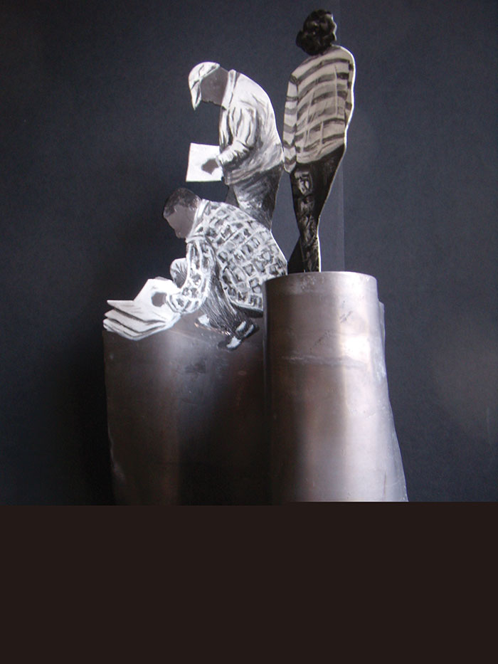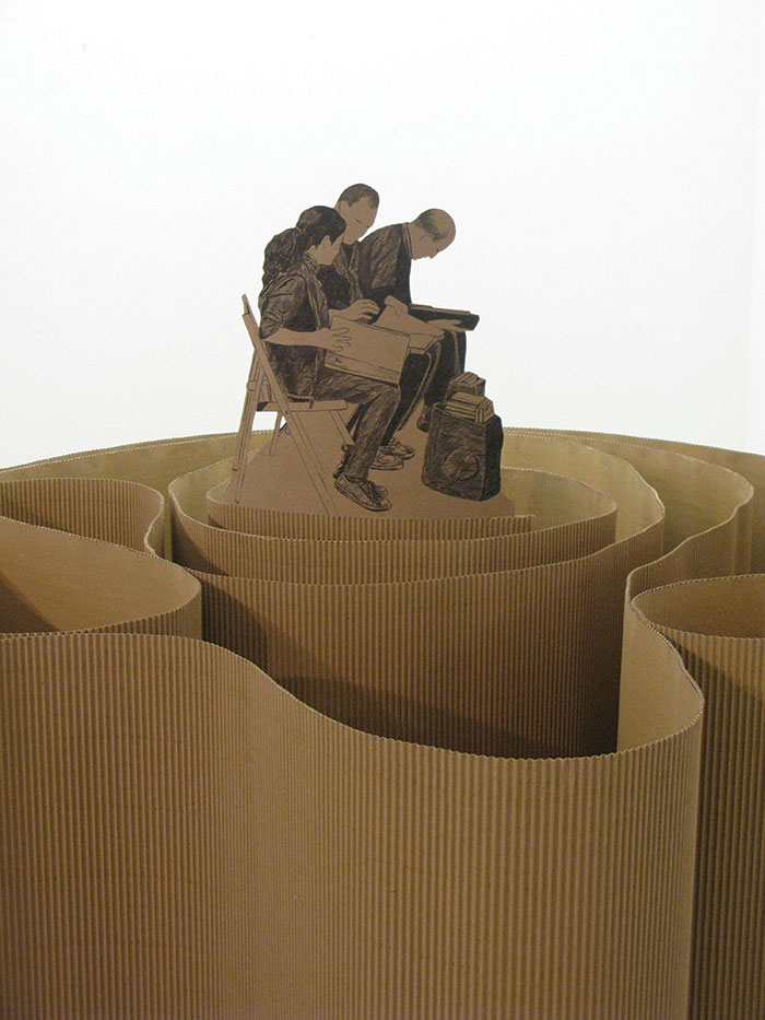 La muestra tiene dos tipos de piezas, de cartón, elevadas sobre enormes –sobre todo en comparación con las figuras– espirales también de cartón, y las de plomo, que reposan en baldas de cartón en la pared. El centro de la sala está tomado por el cartón, anaranjado, y las de plomo, grises, quedan dispuestas en las paredes. Los dos materiales –cartón y plomo–, dos materiales modestos, están pintados y hay una cierta unidad cromática en todo el conjunto. Eso en cuanto a la materia, que es importante pero no lo es todo. Las esculturas dibujadas de Berridi presentan figuras humanas, muchas en grupo, y lo que más llama la atención es que en todos los casos sujetan un libro o miran unos papeles, ensimismados en esa tarea que llevan a cabo. En muchas piezas hay maletas, las figuras son humanas y se distinguen entre sí: hay un laborioso trabajo detrás, pero al mismo tiempo fresco y nada recargado. Se adivina una cierta espontaneidad en la realización.