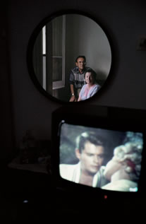 Cuando la televisión parecía aún capaz de convertirse en un instrumento didáctico y ameno, decidí volcar mi creatividad en el medio televisivo. Al cabo de unos siete años, acabé rindiéndome a la evidencia: la calidad de los contenidos avanzaba como lo hacen los cangrejos. Hasta tal punto perdí el interés por la pequeña pantalla, que los televisores desaparecieron incluso de mi obra fotográfica, en la que los había utilizado como vehículo de reflexión y autoanálisis. Observando la imagen de Navia, me doy cuenta de que hoy ni siquiera reparo en esos electrodomésticos. Así como antes constituían para mí un centro natural de reunión —«chimeneas frías», los llamó Bob Shranks—, ahora me resulta difícil recordar el lugar que ocupan en las casas de mis amigos. Esta fotografía, en la que se adivina que la única forma de escapar de una realidad dificultosa es la que representa el rectángulo luminoso, me ha producido la misma sensación que se experimenta cuando encontramos en un desván el juguete preferido de nuestra infancia. Igual que se pierde el rastro de los amigos que acompañaron nuestros primeros juegos, se borra el contorno de los objetivos que fueron primordiales. La interpretación de lo que vemos viene dada por la propia biografía. Pero no es tristeza lo que me inspira esta escena de soledad a dos recogida por Navia, sino la convicción de que para cada uno de nosotros hay muchos caminos por explorar.