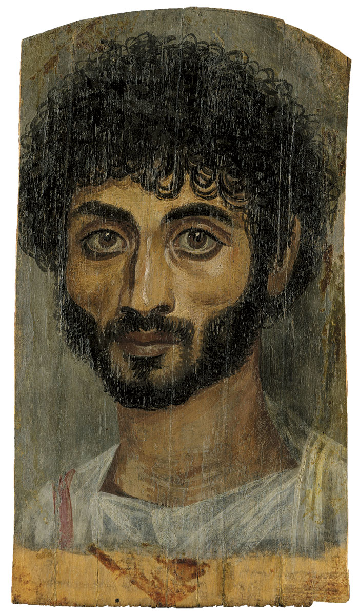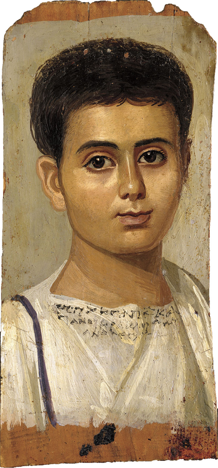 18. El contenido de verdad de un retrato reside en su capacidad de detenernos en la cuestión que plantea un único individuo. Nuestra relación con los retratos de El Fayum sería completamente distinta si pudiéramos pensar en ellos como imágenes genéricas. Pero no es en absoluto el caso; se trata, más bien, de retratos individuales, a los que a veces acompaña un nombre o una profesión, inscritos en el entramado de vendajes. Es el caso de la Hermionè grammatiké [Hermione, institutriz] conservada en Cambridge . Repartida a lo largo de los dos o tres primeros siglos de nuestra era, procedente principalmente de los ambientes griegos del Egipto romanizado, tenemos delante, literalmente, a toda una población. Y si como ha dicho el apóstol Juan, el gesto de habérnoslos devuelto es un gesto «pueril e imperfecto», nosotros debemos sentirnos en deuda con los pintores que lo hicieron posible. Aunque no sepamos nada de ellos, de sus talleres, ni de las modalidades de los encargos que recibieron, han sido ellos quienes nos han hecho llegar estos rostros. La perfección y la madurez que imagina Juan no podrían alcanzarse si no se abandona el caldo de cultivo de esta población de rostros –una institutriz, una matrona, un sacerdote de Sarapis, un soldado, chicos jóvenes e incluso niños–, y a esta multitud es a la que vendrá a oponerse, a tapar e incluso a prohibir el rostro imperioso del Uno triunfante, la cara abrumadora del Cristo Pantocrátor de la época bizantina. Entre las máscaras a las que sustituyen y los iconos que anticipan –al menos estilísticamente y, sobre todo, al final del período–, los retratos de El Fayum lograron imponer, durante algún tiempo, el rostro; y no lo hicieron como una reivindicación altiva sino, más bien al contrario, como una suerte de visado hacia lo desconocido.