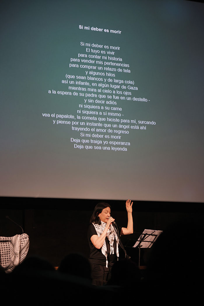 El pasado 16 de abril la poeta y artista palestina Rafeef Ziadah, en colaboración con el músico Phil Monsour, estremeció al público que llenó el Cine Estudio del Círculo con su recital «Let it be a tale», un verso del último poema que escribió el poeta Refaat Alareer, asesinado en Gaza el pasado 6 de diciembre en un bombardeo israelí: «Si mi deber es morir, que sea con esperanza. Que sea una leyenda». Sarah Babiker la entrevistó al día siguiente para Minerva: «Ayer el público me respondía, los palestinos respondían en árabe, la gente empezó a corear. Fue extraordinario mantener esa conversación».