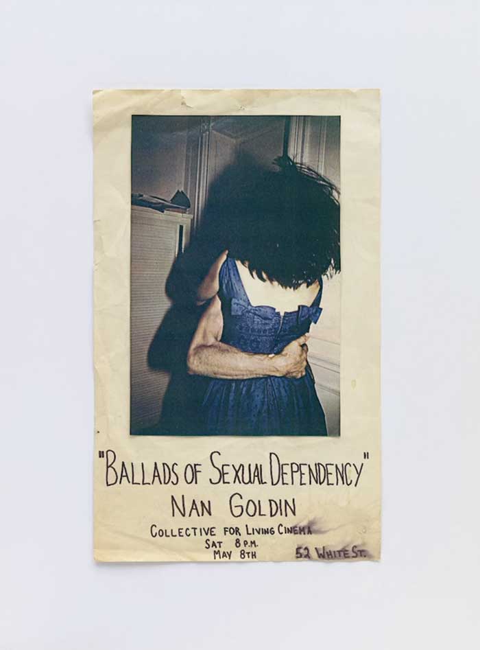 The Ballad of Sexual Dependency [La balada de la dependencia sexual] (1983-2022) fue la serie con la que alcanzó mayor repercusión. Ella misma explica que el eje que vertebra estas fotografías es la lucha entre la autonomía y la dependencia, que el hilo conductor de la serie es el poder; concretamente, el que los hombres ejercen sobre las mujeres, y cómo se traslada a la sociedad. La idea del poder que se transforma en violencia física contra las mujeres se materializará de una manera descarnada en los autorretratos que toma en 1984, después de la brutal paliza que le propinó su novio de aquella época. Una paliza que casi la deja ciega y que, sin embargo, sirvió para visibilizar otra realidad escondida –la del maltrato a las mujeres– y permitir que otras mujeres fuesen capaces de articular lo que les estaba pasando. Una selección de esas imágenes se publicó en 1986 en un libro. De nuevo los mecanismos del poder patriarcal se pusieron en marcha, ya que tanto su padre –que no quería que saliese a la luz el suicidio de su hija Barbara– como su exnovio intentaron parar la publicación, lo que hacía de estas fotografías un acto político aún más radical. A partir de ese momento, Nan Goldin toma la decisión de dedicarse plena y profesionalmente al arte.
