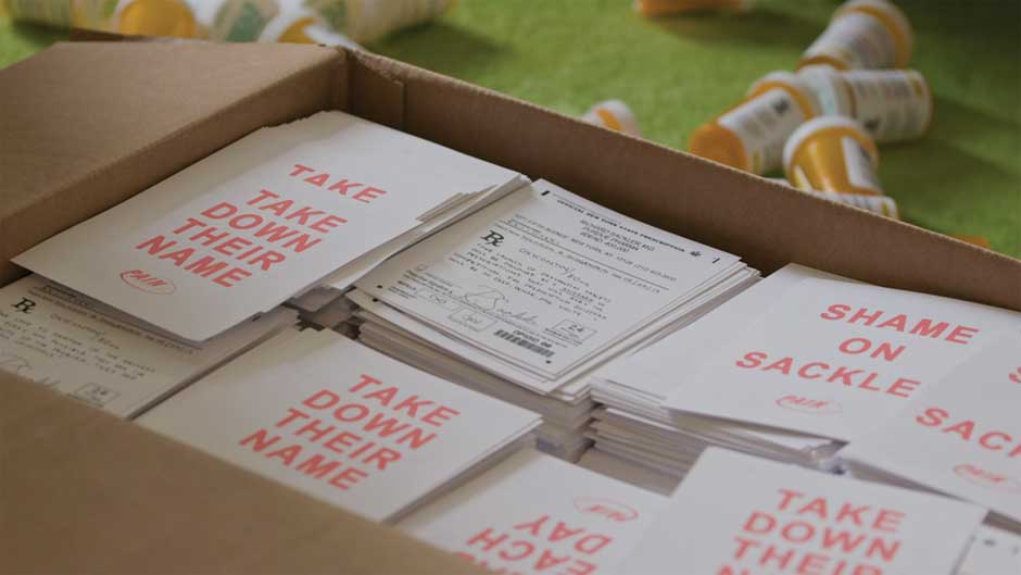 Los activistas de PAIN, como hicieran los de ACT UPACT UP es un colectivo activista de lucha contra el sida, nacido en Nueva York en 1987. Es un grupo de acción directa y desobediencia civil que busca incidir en la sociedad, en la política y en la industria farmacéutica a través de distintas estrategias de presión para acabar con la crisis del sida y mejorar la vida de las personas que viven con el virus. Sigue activo en la actualidad. en los años ochenta y noventa, utilizarán como arma principal la desobediencia civil, el arte de guerrilla y la acción directa para intervenir en los espacios que jugaban un papel fundamental en la crisis de los opiáceos. De ACT UP, el espejo en el que se miran, tomarán el uso de elementos cotidianos, haciendo un ejercicio de apropiación y modificándolos levemente para adaptarlos a un uso activista. Así, en el documental vemos que utilizan botes de OxyContin vacíos, cuyas etiquetas han modificado al incluir información sobre el número de muertos o datos sobre el colectivo. También fabricarán billetes falsos de «oxyDólar» con el lema «In pharma We Trust» o recetas que, por una cara incluían la frase que Richard Sackler, presidente de Purdue Pharma, pronunció durante el lanzamiento del medicamento, en 1996 –«El lanzamiento de OxyContin irá seguido por un vendaval de recetas que enterrarán a la competencia»–, mientras que en la otra cara se leía: «Quitad sus nombres». Junto a estos objetos, los cuerpos de los activistas también serán un eje del activismo de PAIN y, de nuevo, tomará como ejemplo las estrategias desarrolladas por ACT UP: desde los zaps, acciones puntuales y fugaces, pero también muy llamativas, que se producen en un momento y en un lugar determinados elegidos estratégicamente, o los ya mencionados die-in o, dicho de otra manera, hacerse el muerto; una acción espectacular que implica la actuación de muchos cuerpos en un mismo espacio. El Metropolitan, donde se desarrolla la acción que abre el documental, y otros museos como el Guggenheim o el Louvre, serán los escenarios en los que tienen lugar algunas de las acciones con mayor trascendencia de PAIN.