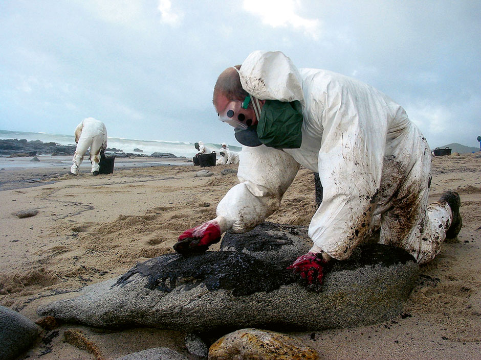 Un voluntario limpia la playa de chapapote en una imagen del corto documental Historias del chapapote, de Stéphane M. Grueso, 2003. CC BY-SA 2.0