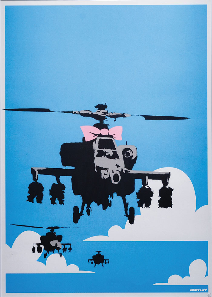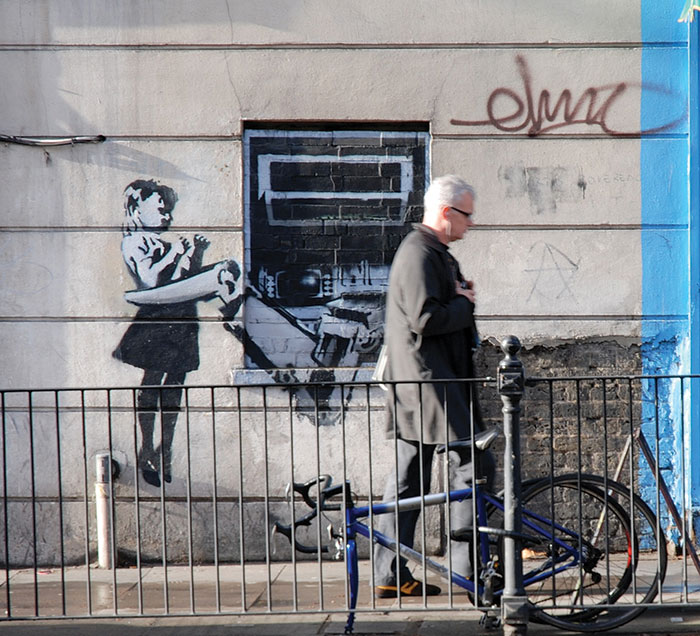 En Banksy sí podemos hablar de la existencia de varias capas de significado. Algunas aparecen cuando se tiene en cuenta la relación con el contexto espacial y su relación con otros elementos del entorno, como su emplazamiento en barrios determinados o en edificios y construcciones emblemáticos. También se relacionan con el contexto temporal, con el momento en el que estas obras aparecen. Podemos entonces hablar de capas, pero no podemos hablar de ambigüedad de significado, porque en las obras de Banksy no pueden darse al mismo tiempo una idea y la contraria. El patrón descrito será común en muchas de sus piezas: yuxtaposiciones que generan contraste, shock, condena y llamada a pensar. Pero ¿quién se detiene y piensa? El que ya ha sacado la misma conclusión que el artista. Volveré sobre esto luego.