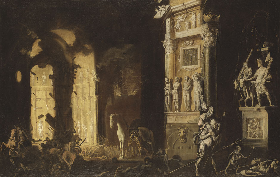 La quema de Troya con la huida de Eneas y Anquises, François de Nomé, s/f.