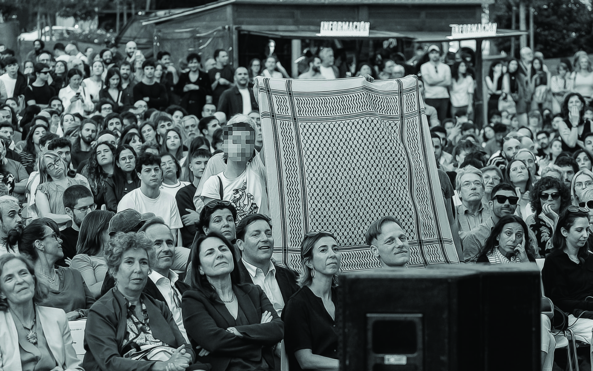 Acción de protesta durante la charla inaugural entre la socióloga franco-israelí Eva Illouz y la periodista Lara Siscar. © Rafael Fraile