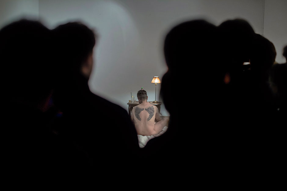Esa misma noche, ella dijo que no era agradable follarse a un viejo borracho, y que no existía ningún tipo de empatía hacia eso. Ese putero viejo y borracho podría ser mi padre biológico. En ese momento, decidí diseñar la pieza Empatía y Prostitución, que era un proceso de empatía con la noche en la que me gestaron. Viajé a Bogotá, y la casualidad quiso que expusiera en una sala que había sido un prostíbulo. Se dieron un número de casualidades que empujaron a que la pieza se materializara allí. Por ejemplo, nada más llegar a Colombia y montarme en un taxi, el taxista me dijo que me llevaba a comprar cocaína y adonde estaban las prostitutas. Por ser blanco y venir de Europa, me ofrecía lo que los europeos solían buscar allí… Fue la primera vez que expuse mi cuerpo en una performance, y lo hice con un fin de búsqueda propia y de búsqueda de la historia de mi madre. Posteriormente, la obra ha ido nutriéndose de un discurso en torno a la prostitución, desvelando la postura crítica que hay en estas piezas.