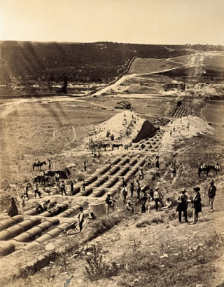 La fotografía de Clifford nos muestra un amplio paisaje marcado o taladrado por las conducciones de la traída de aguas para el Canal de Isabel II. La fecha, 1855.